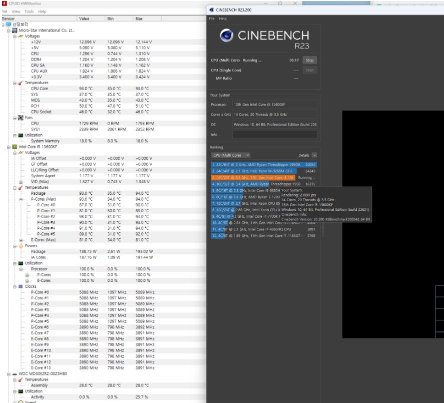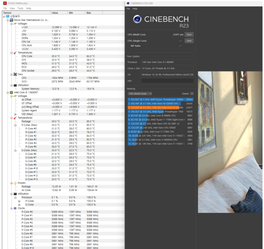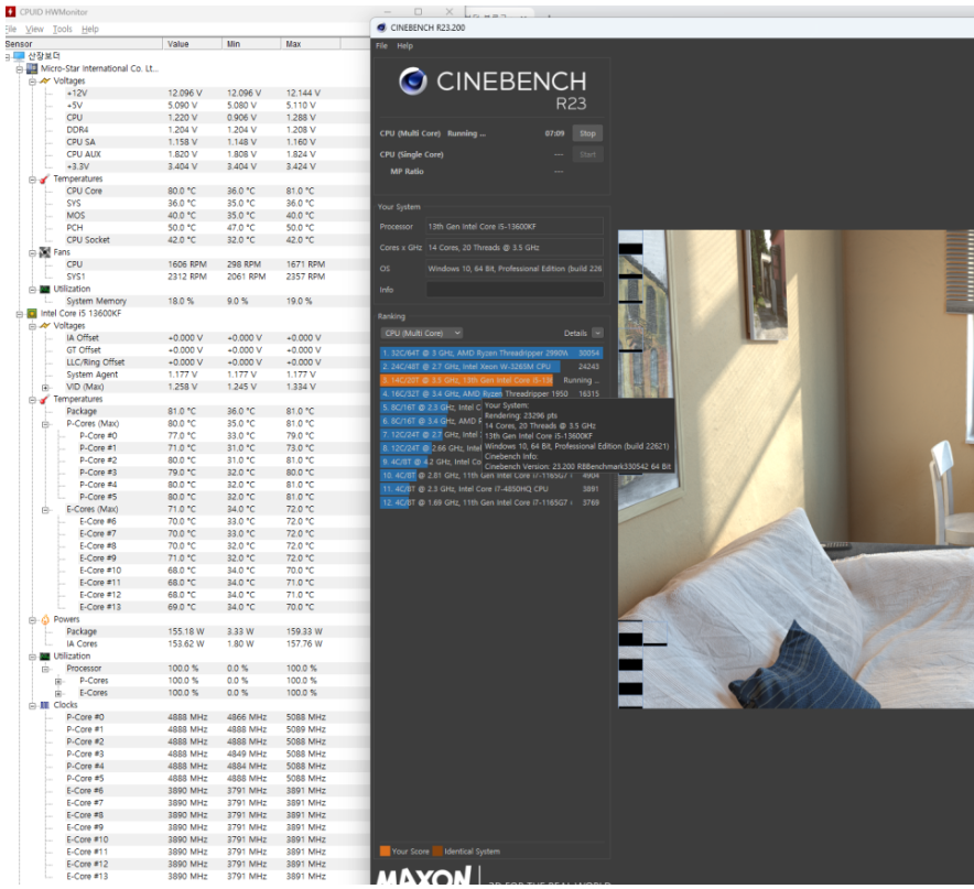 테스트는 PC부팅 후 아무것도 하지않고, HW Monitor를 띄워논 후에에 CINEBENCH R23 프로그램 기본 상태로 멀티코어 테스트를 약 5분 내외 돌리면서 CPU MAX 온도, CPU 전력량(Powers), 최고 Clock, CineBench 점수를 확인 합니다.